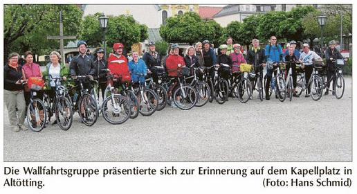 Schon zum neunten Mal hatte die Pfarreiengemeinschaft Mitterfels-Haselbach/Herrnfehlburg zu einer Rad-Wallfahrt nach Altötting eingeladen. Knapp 30 Teilnehmer im Alter von 15 bis 77 Jahren machten sich kürzlich auf den Weg, um in gläubiger Gesinnung und mit gemeinschaftlichem Gebet und Gesang mit Maria unterwegs zu sein. Obwohl die Witterung so manche Kapriolen schlug, erreichte die Gruppe ohne Probleme den Marienwallfahrtsort Altötting.