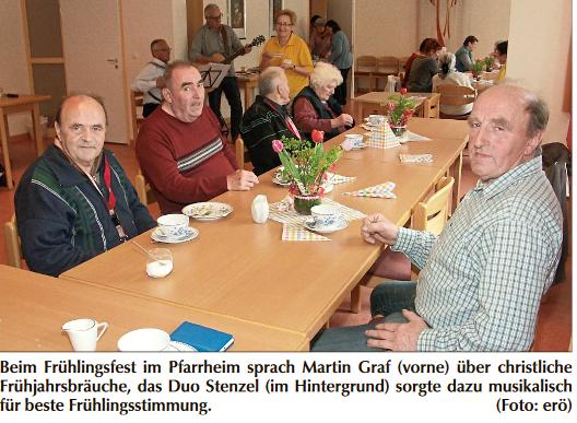 Echte Frühlingsstimmung herrschte beim ersten Frühlingsfest der Pfarrgemeinde und der Marktgemeinde im Pfarrheim. Senioren wurden bei dem Erzählcafé über das Thema „Christliche Frühlingsbräuche“ bei Kaffee und Kuchen und frühlingshafter Musik mit dem Duo Heinrich und Norbert Stenzel.