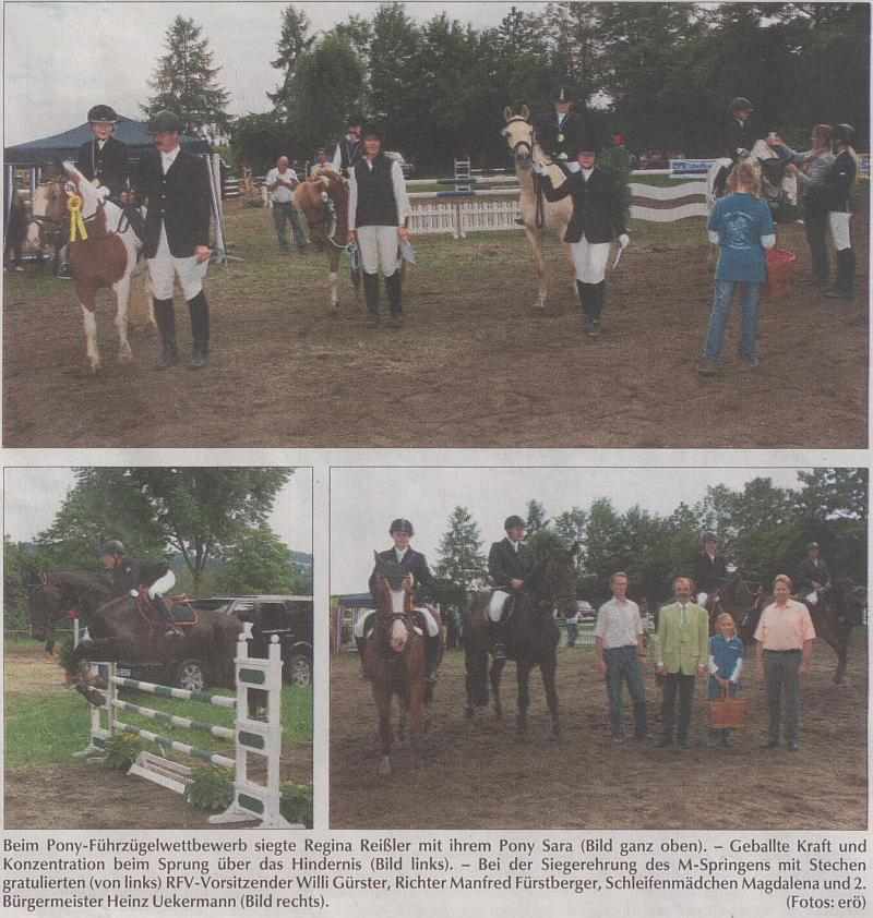 Es siegte Regina Reißler auf Pony Sara vom RFV Geisenhausen. Als Zweitplatzierte freuten sich die übrigen Teilnehmerinnen Laura Pellkofer, Jana Lang und Daniela Bauer (RFV Mitterfels). Die Springen am Samstag fanden überwiegend im Regen statt und reichten von einer Reitpferdeprüfung über ein Stilspringen Klasse E und A bis zu Springen der Klassen A und L sowie einem Zwei-Phasen-Springen der Klasse M. Im Stilspringen Klasse E belegte Lena Kreisel vom TG Rennbahn Straubing die bei den ersten Plätze. Wegen des tiefen Bodens mussten nicht nur die Voltigiervorführungen der Mitterfelser Voltigiergruppe ausfallen, sondern auch die Ehrenrunden im Galopp. Auch das letzte Springen des Tages, das Zwei-Phasen-Springen Klasse M, litt unter dem Regen: statt der gemeldeten 18 Teilnehmer starteten nur fünf. Es siegte Christian Knoch (Pferdefreunde Nürnberger Land) vor Julia Klausmeister (RSG Weiden). Die Meldestelle betreute Matthias Niemczyk.