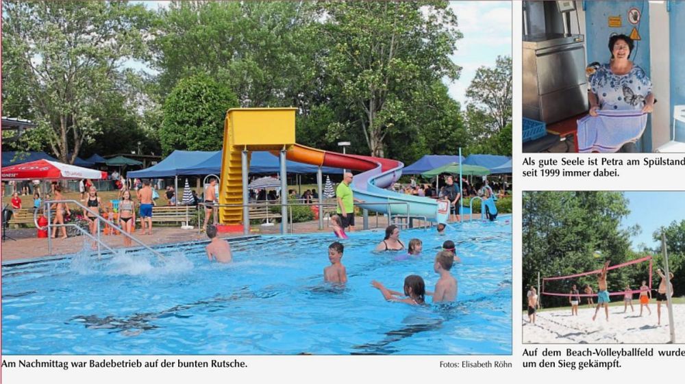 Der Eintritt war frei, allerdings hielt sich der Badebetrieb wegen des kühlen Windes in Grenzen. Eine Chance für eifrige Schwimmer, die das Becken weitgehend für sich hatten. Los ging es am Vormittag mit einem spannenden Beach-Volleyballturnier und Gaudimannschaften mit Fantasienamen. Schiedsrichter war Kilian Pinke, Vater Georg zählte die Treffer. Dabei ging es hauptsächlich um den Spaß am Sport. Zum Mittagessen gab es traditionell Grillspezialitäten und Steckerlfisch, in der Cafeteria war ein umfangreiches Kuchen- und Tortenbuffet aufgebaut, das von den Familien am Nachmittag gestürmt wurde. Das für den Nachmittag geplante Kinderprogramm musste allerdings wegen Erkrankung der Verantwortlichen zum Bedauern der Veranstalter komplett ausfallen.